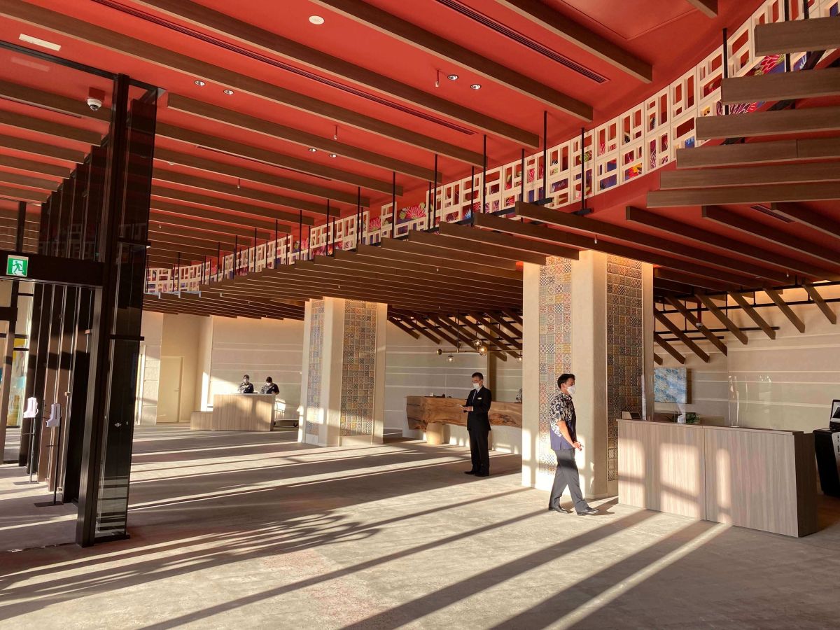 エントランスも沖縄らしさが詰め込まれていて、フロント上部は沖縄を代表とする花ブロックの奥に染物・紅型(びんがた)の意匠を施したデザインが!フロントカウンターの奥も紅型で染めたアートが飾られています。