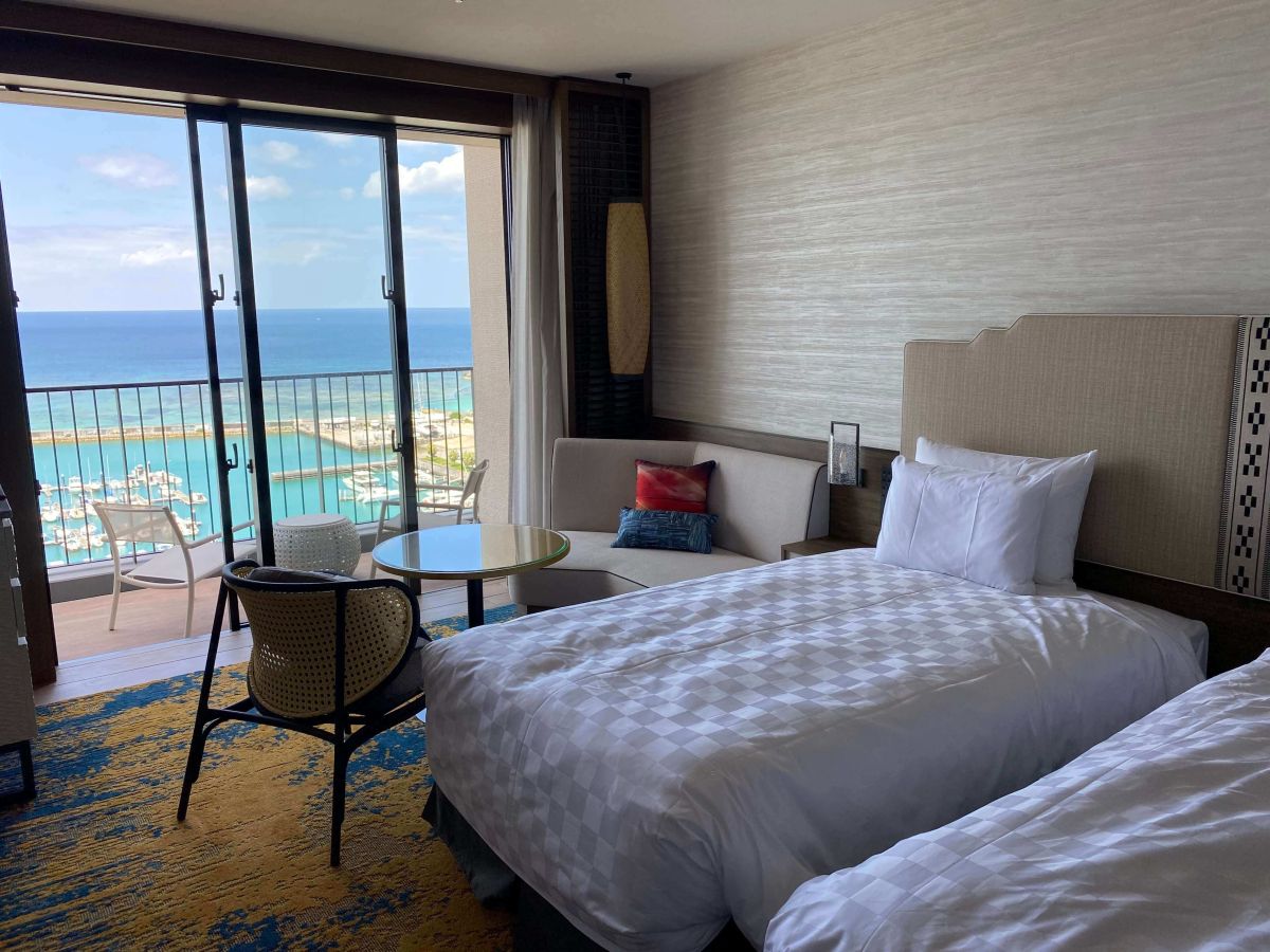 今回宿泊した「クラブツイン」のお部屋は、12階、13階の客室に設置されていて、大きなベットが2つあるお部屋。広々としたお部屋と視界いっぱいに広がる青い海が相まって開放感抜群です。