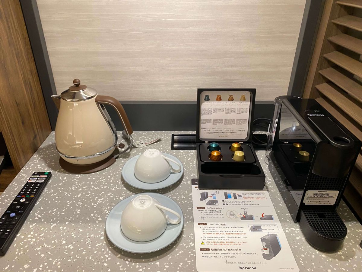 もちろんお部屋の設備も大充実。お風呂はユニットバスで、なんと浴室内の明るさも調整可能。さらに、沖縄らしい入浴剤がアメニティとして用意されています。Panasonicの最新のドライヤーやコーヒーマシンも設置されていて、もう本当に快適に過ごせちゃうのです。