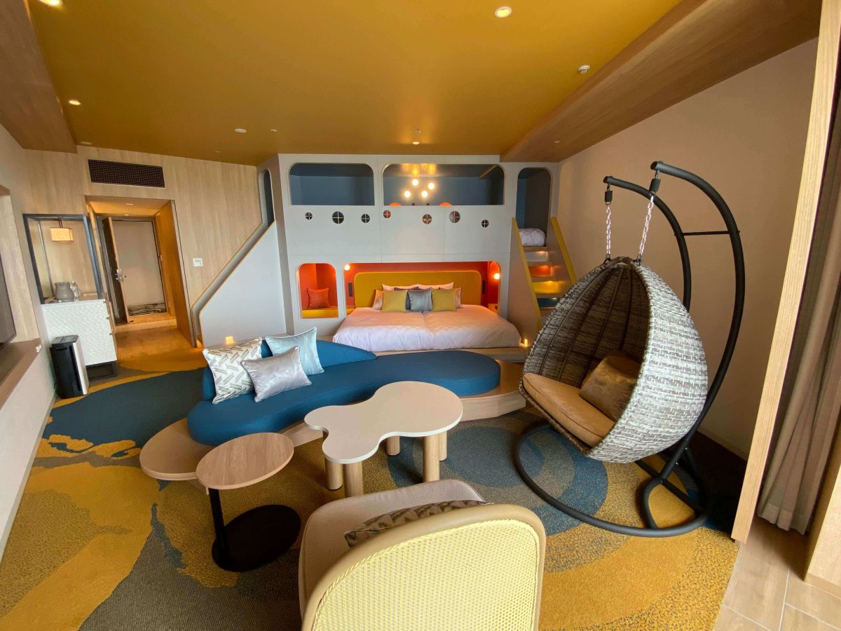 2段ベッドやゆらゆら揺れるハンモックのような椅子、お部屋全体にカラフルな配色が施されていて、大人も子どももワクワクすること間違いなしです!また、49.6㎡とかなり広いので数人グループでの宿泊にもおすすめです。