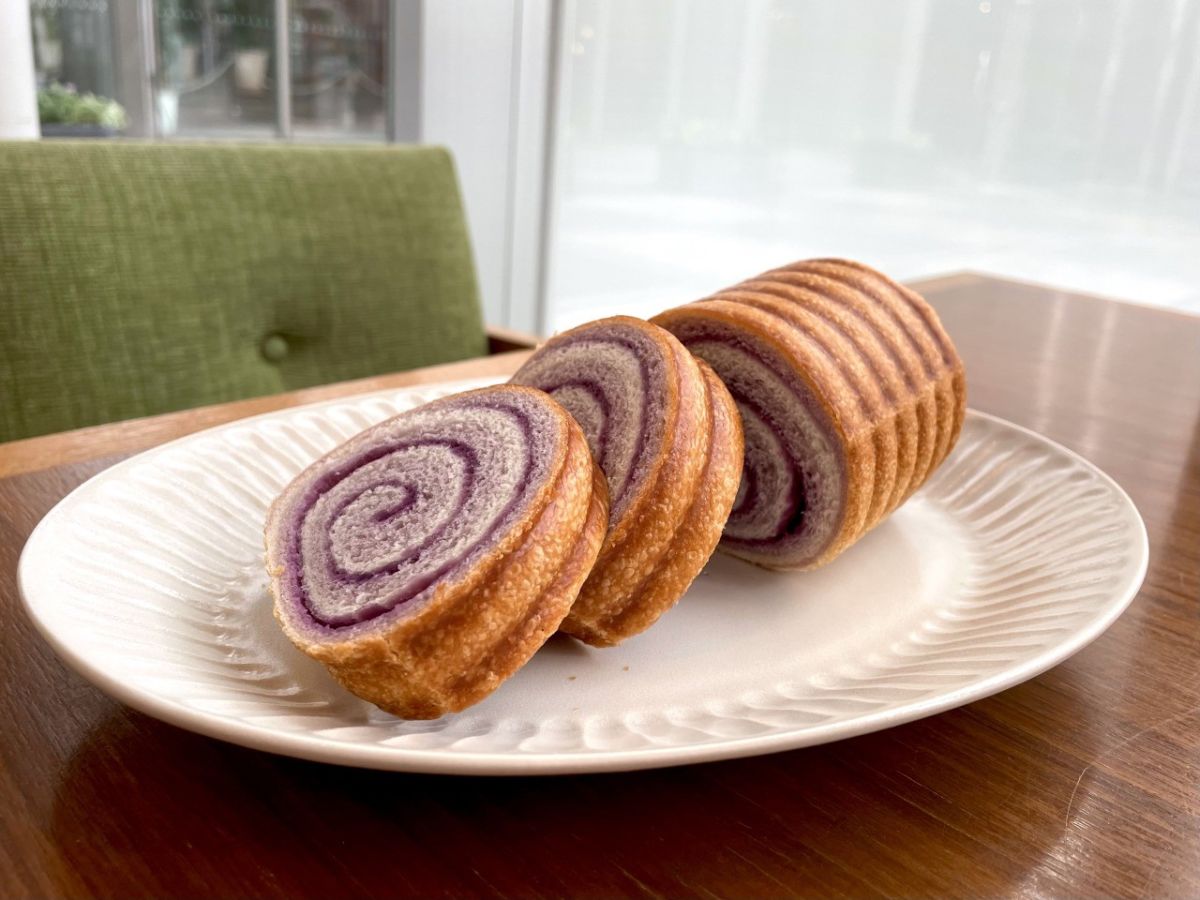 一つ目は断面のマーブル模様が可愛い「紫いもロール」500円。紫いもパウダーを練り込んだ生地とプレーン生地を重ね、さらに紫いもペーストを塗って3層に仕立てられています。