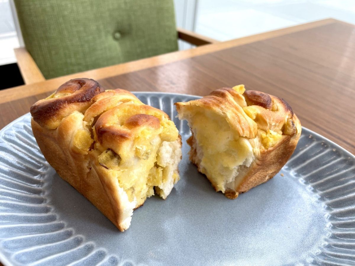 こちらは「さつまいもブレッド」400円。バターたっぷりのブリオッシュ生地にさつまいもクリームとさつまいものダイスカットを巻き込み焼き上げた一品。
