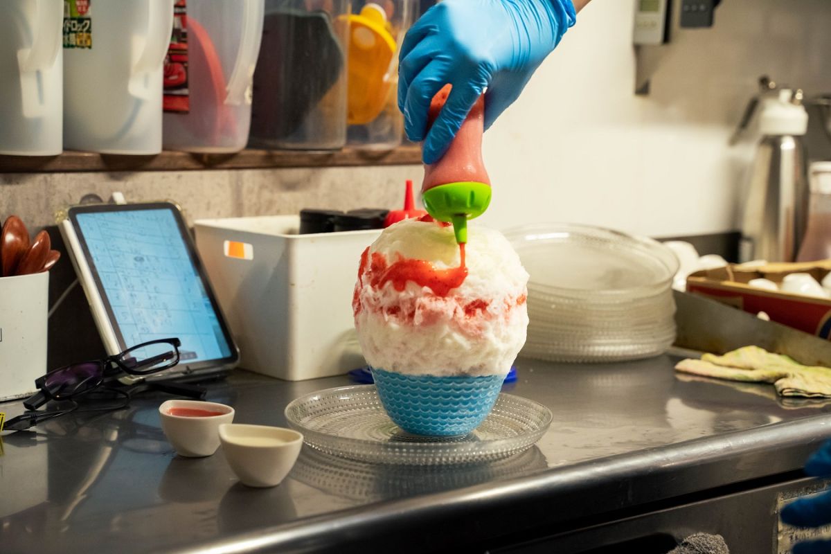 氷のふわふわ感をしっかり楽しめるようにと、丸く形を整えるのは最小限に。表面だけポンポンと丸みをもたせ、シロップと自家製練乳をふんだんにかけて仕上げます。