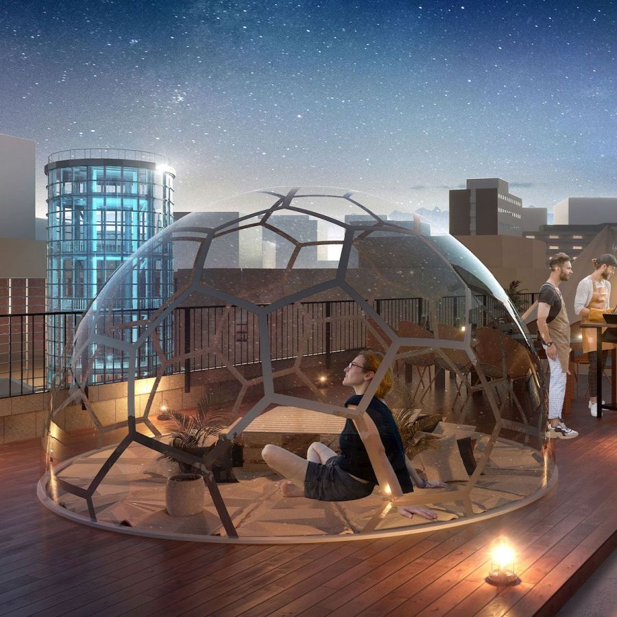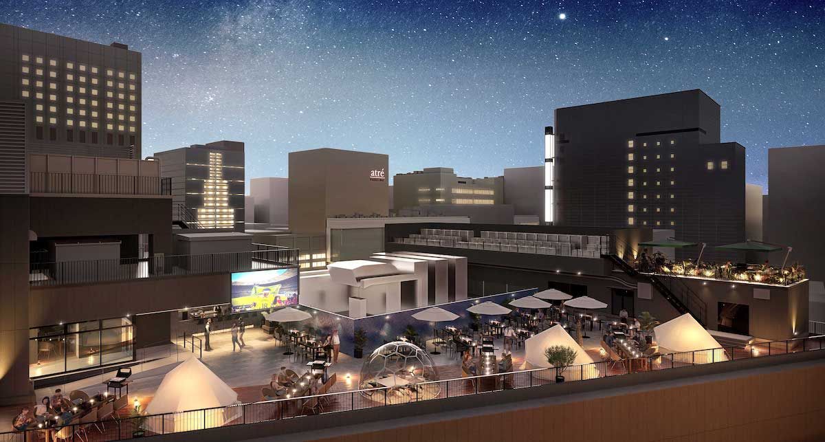 川崎駅から徒歩約5分の商業施設「LA CITTADELLA(ラ チッタデッラ)ビバーチェ」屋上に、2022年7月22日にオープンした「都市型グランピング&BBQ『CIELO GRANDE & 黄金のキッチン』」。