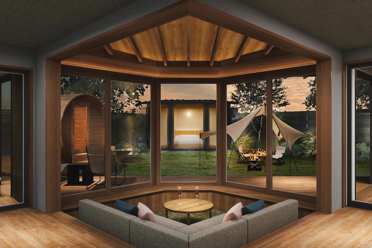 「THE CHIKURA UMI BASE CAMP(ザチクラウミベースキャンプ)」計画の第2弾となるこちらの施設は、雑誌「サウナランド」の編集長である箕輪厚介氏とのコラボレーションによるプライベートサウナを導入した、全4棟の2階建ての宿泊施設です。