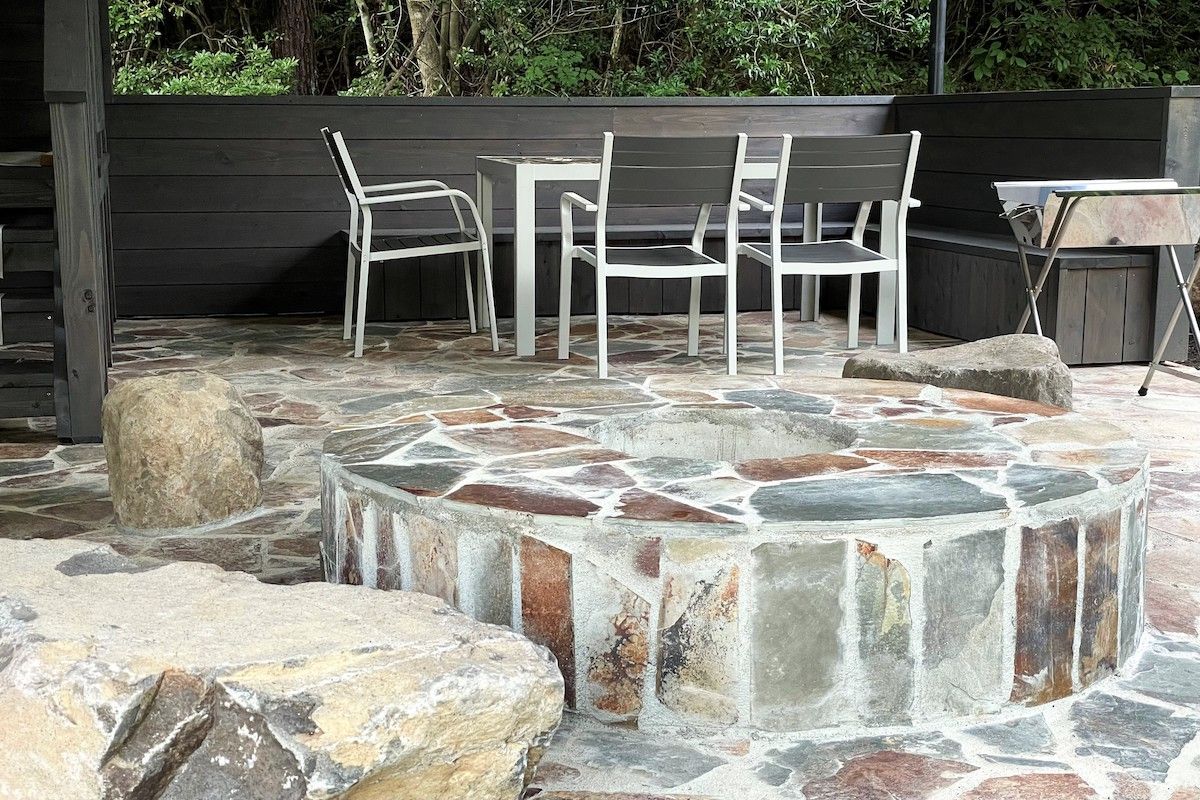 「“焚火”を楽しむ大人のキャンプ」をコンセプトに造られた「Fire Base・TAKIBI」は、職人が手作業で丁寧に貼りあわせた、施設内随一の広さを誇る石張りのデッキに、大型のファイヤーピット(焚火台)が備わり、星空のもと焚火を囲みながら落ち着いた時間を満喫することができます。