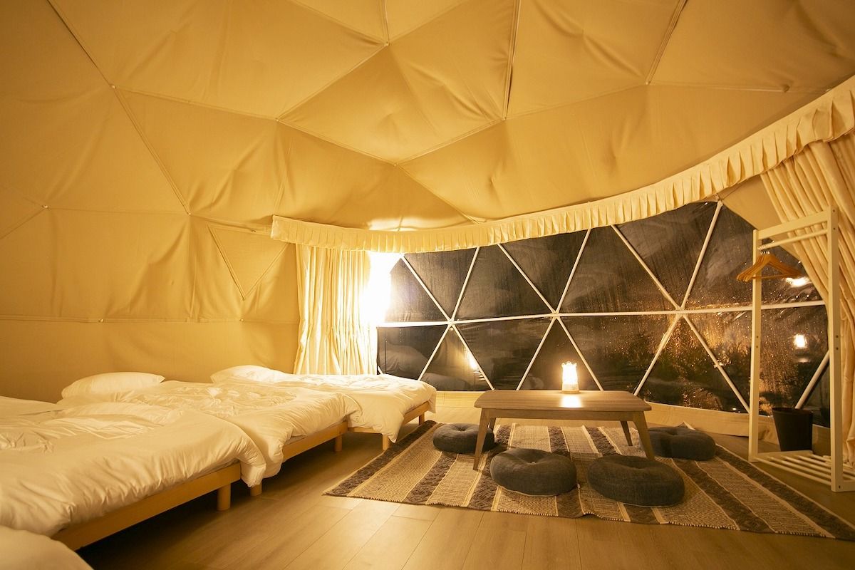客室は、四季折々の虫の声を聞きながら、静かでゆったりとした時間を過ごせる広々としたグランピングドームです。