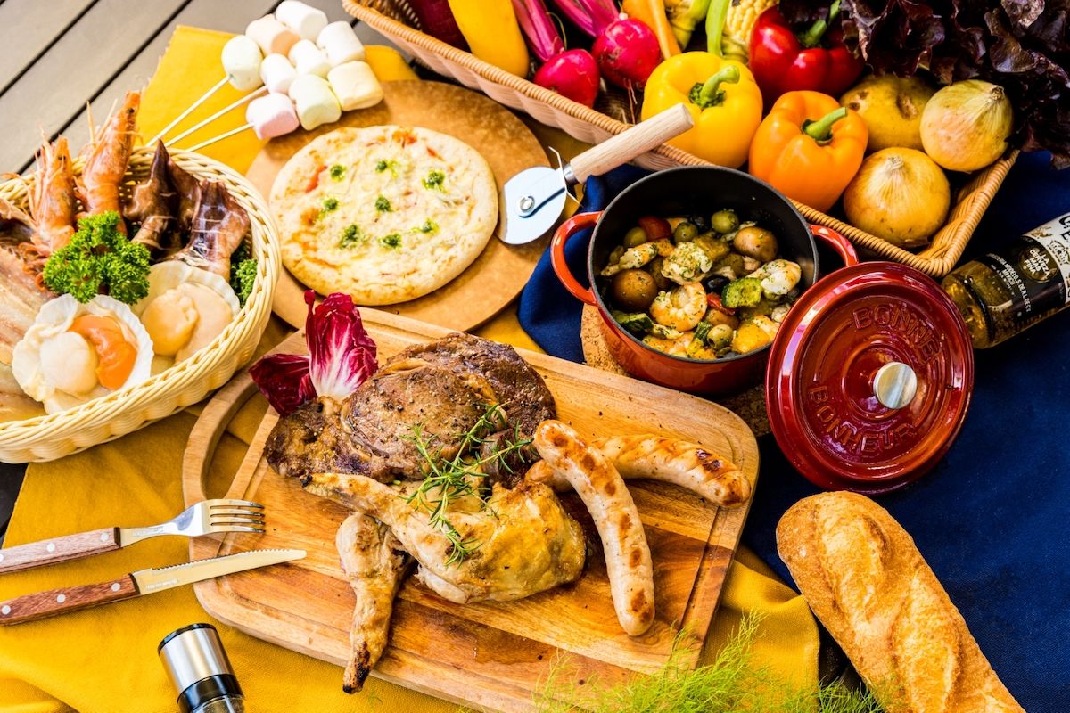 夕食は、肉や海鮮をふんだんに使った贅沢なアウトドアディナーをプライベートデッキで楽しむ