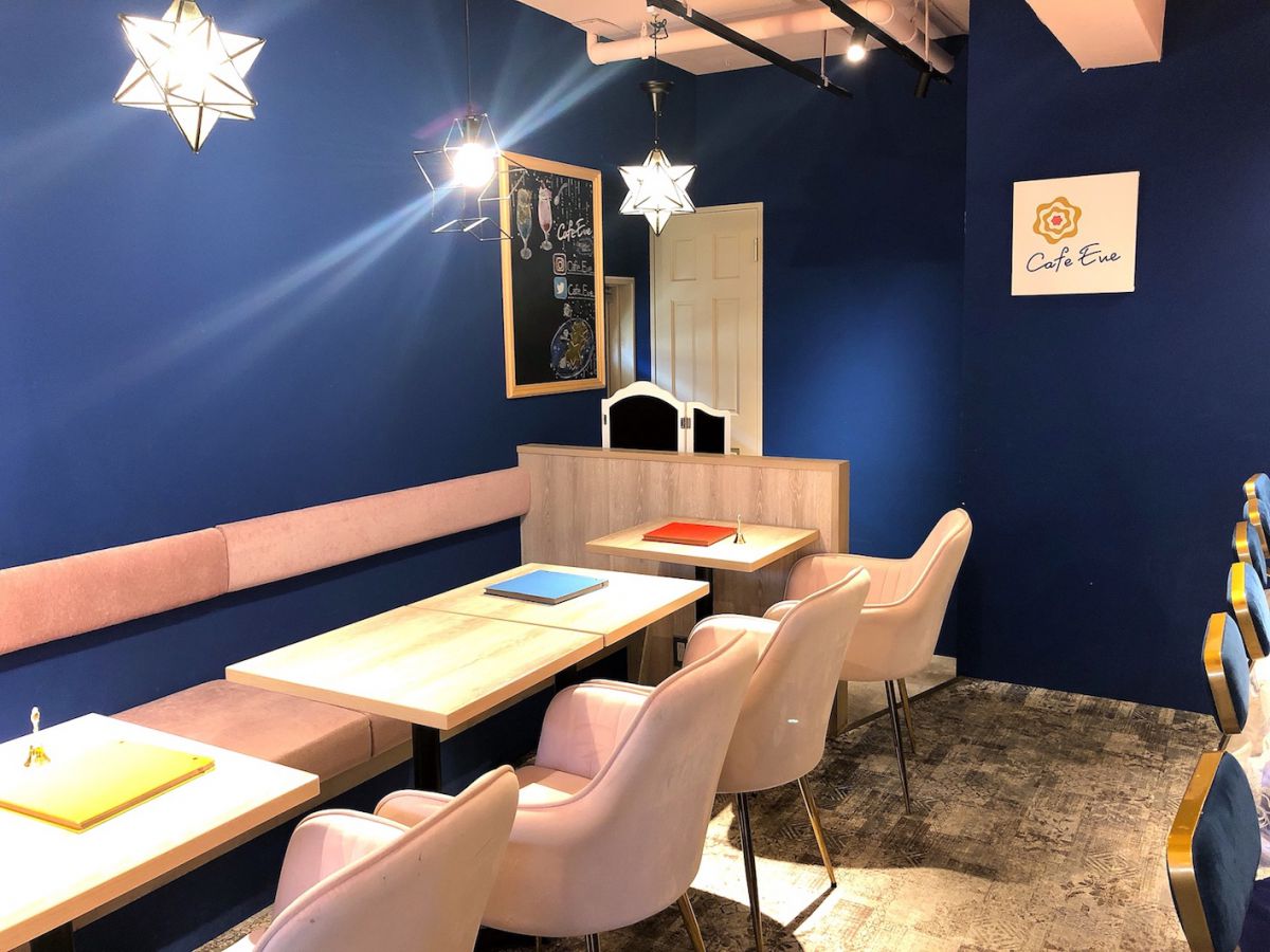 吉祥寺駅から徒歩約3分、階段を上った2階にある秘密基地のような入口の先が、「Cafe Eve(かふぇ いぶ)」です。クリスマスイブや大晦日などイベントの前日にワクワクするような気持ちを感じられる場所をコンセプトに作られたこちらのカフェは、店内に一歩足を踏み入れた瞬間、外とはまったく違ったかわいらしい空間に思わず興奮の声が出てしまいそう!ブルーの壁とピンクの椅子、星型のランプが出迎えてくれます。