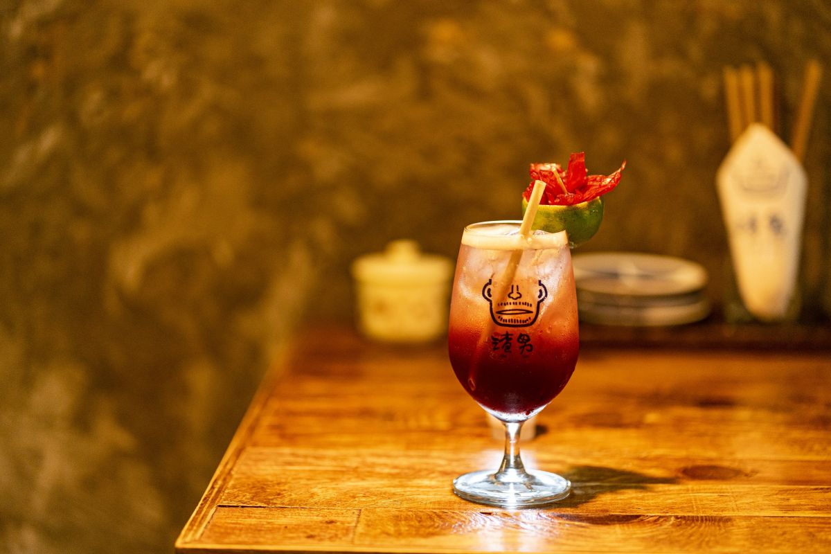 「渣男烏梅醉」NT$280は「烏梅汁」という台湾で親しまれる燻煙した干し梅のジュースをイメージしたカクテルです。キンモクセイのシロップや上にトッピングされたローゼルも台湾らしさ満点。甘酸っぱくスモーキーなアクセントのあるカクテルは、台湾らしい香辛料を使ったお店の料理との相性もバッチリ!