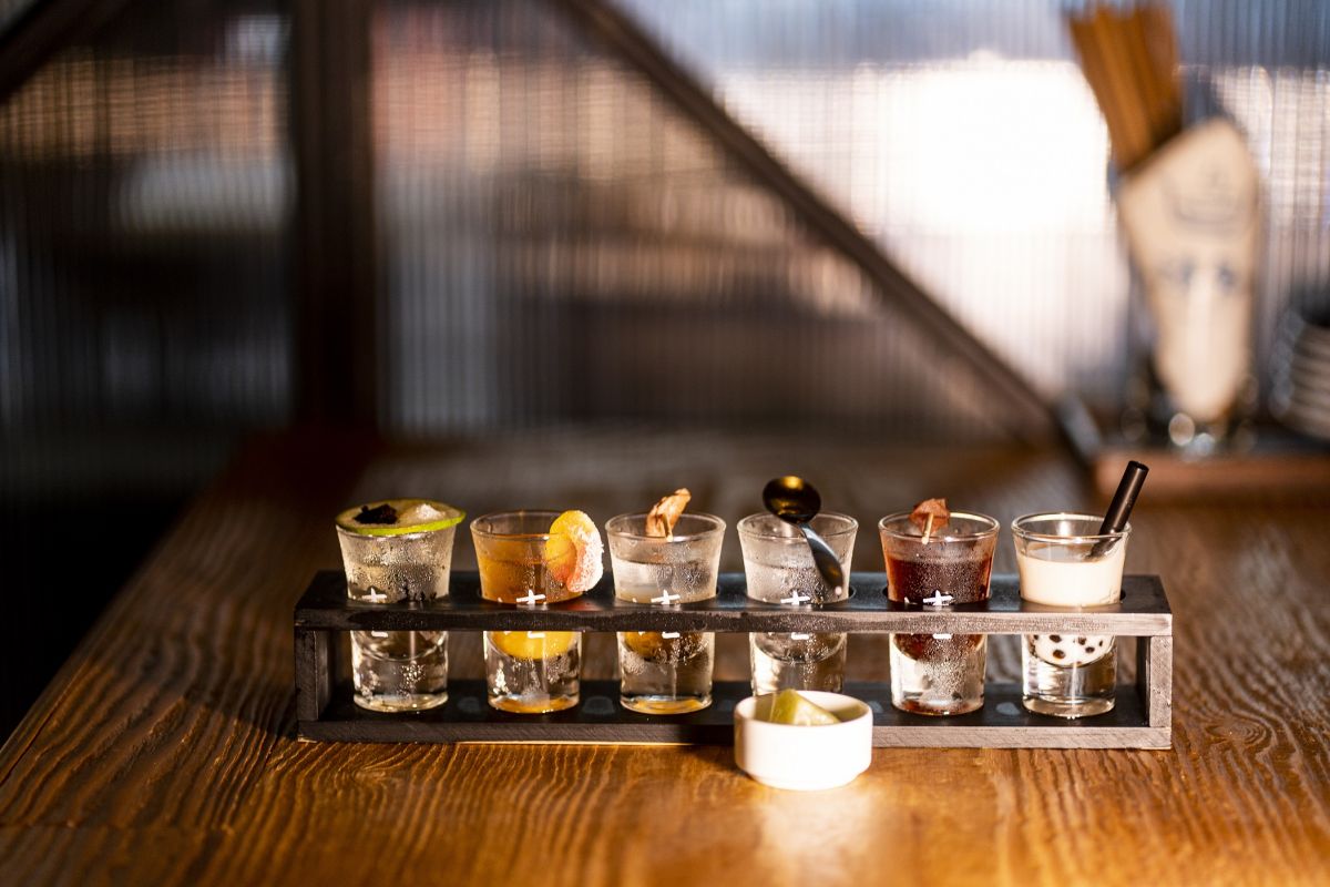 「好Shot流一口乾」NT$600は、6杯の異なる味わいのショットセットです。タピオカミルクティーをイメージしたものや、フルーツやお茶を使用したものもあり、どれも全く異なる味わいです。見た目も華やかで人気のメニューです。ミニマムオーダーは1人1杯のドリンクです。