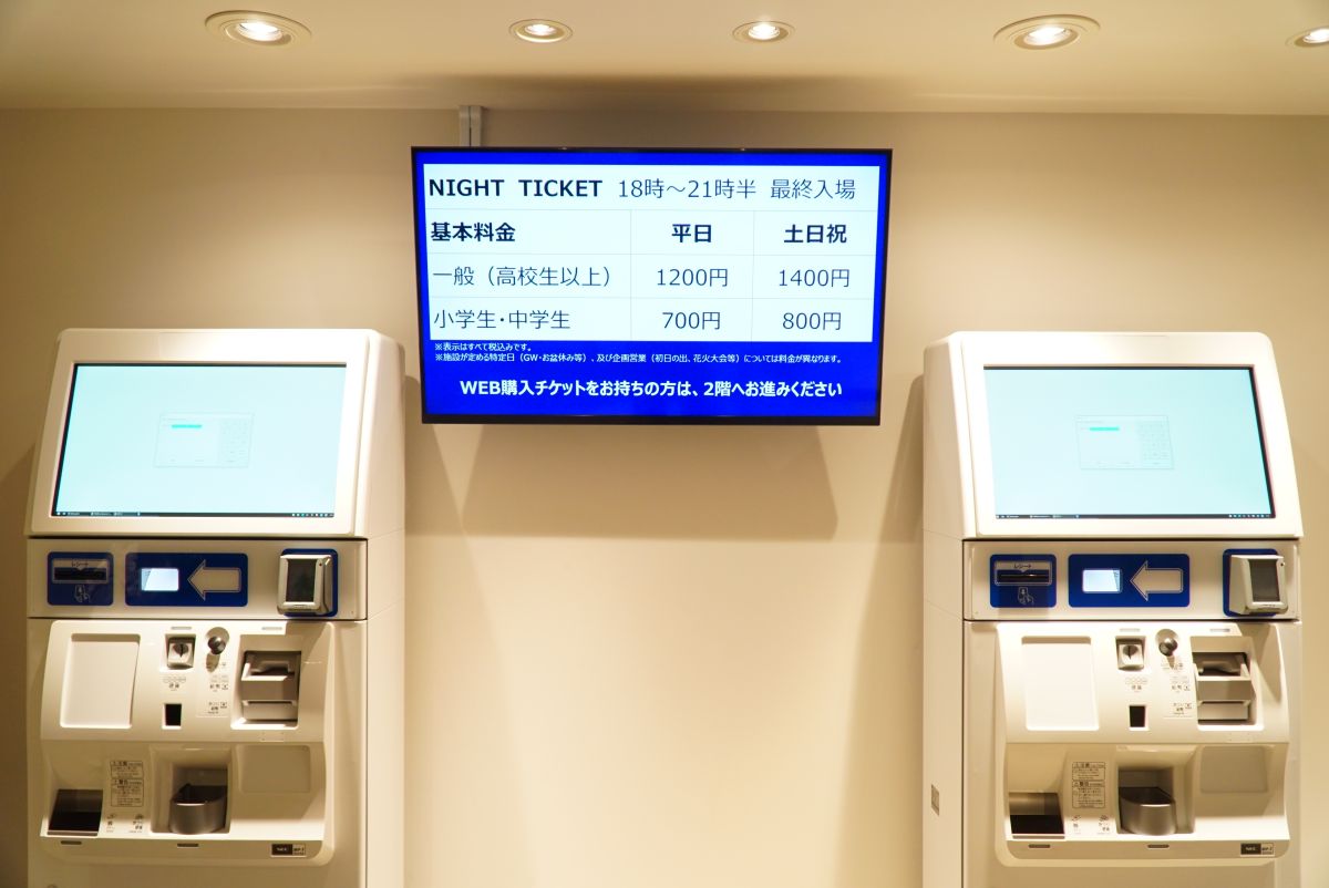 デイチケットは一般(高校生以上)1000円(土・日曜、祝日は1200円)、小・中学生500円(土・日曜、祝日は600円)。ナイトチケットは一般(高校生以上)1200円(土・日曜、祝日は1400円)、小・中学生700円(土・日曜、祝日は800円)です。またオンラインから予約をすれば100円割引になります。
