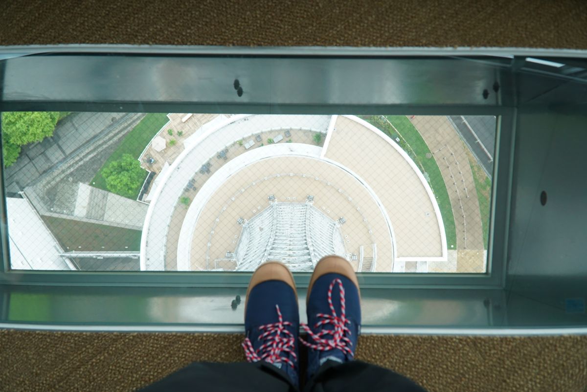 展望フロアには一部床がガラス窓になっていて、地上をのぞける場所も。大人でも意外と歩いてみると足元がゾワゾワっとするので、ぜひチャレンジしてみてくださいね!