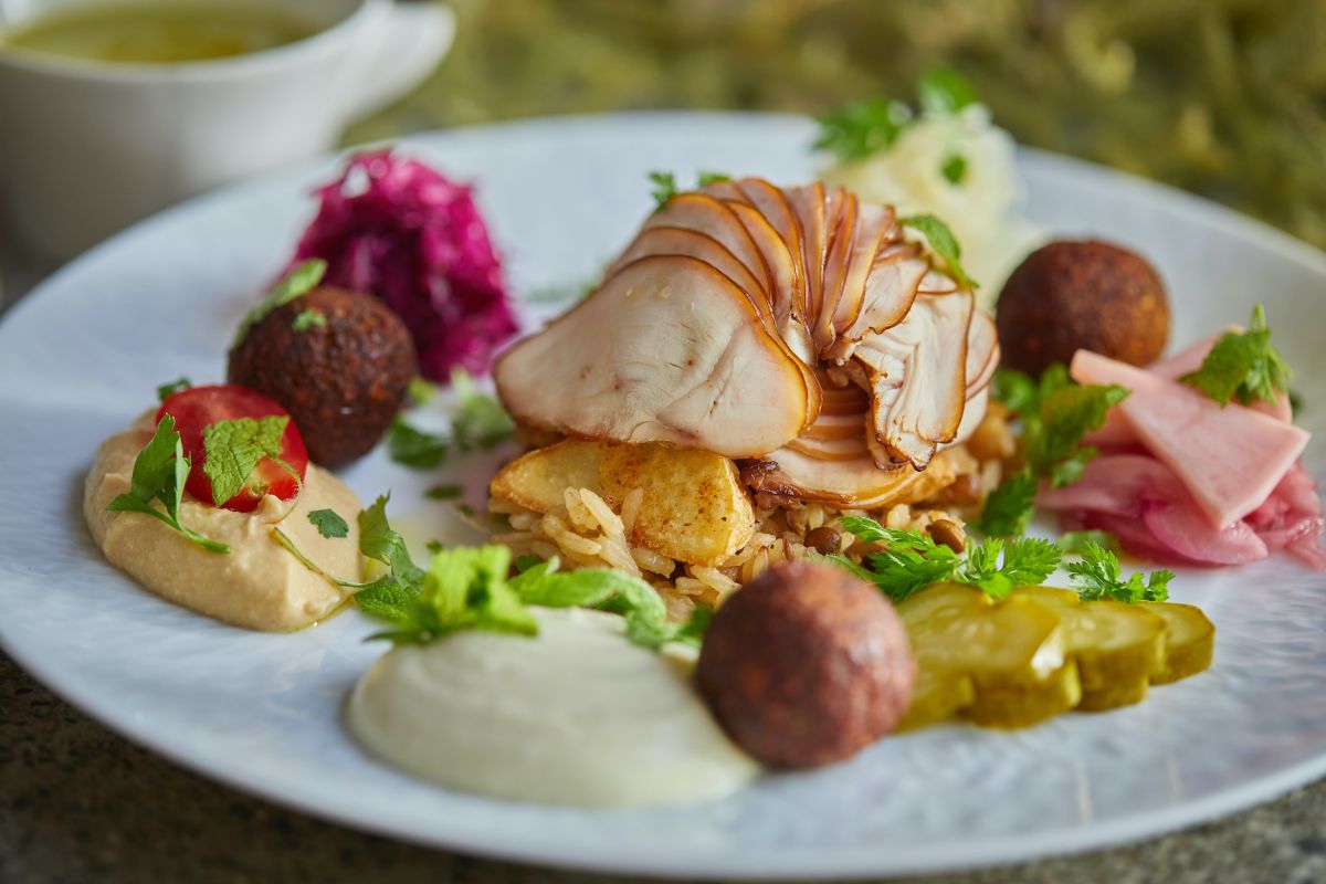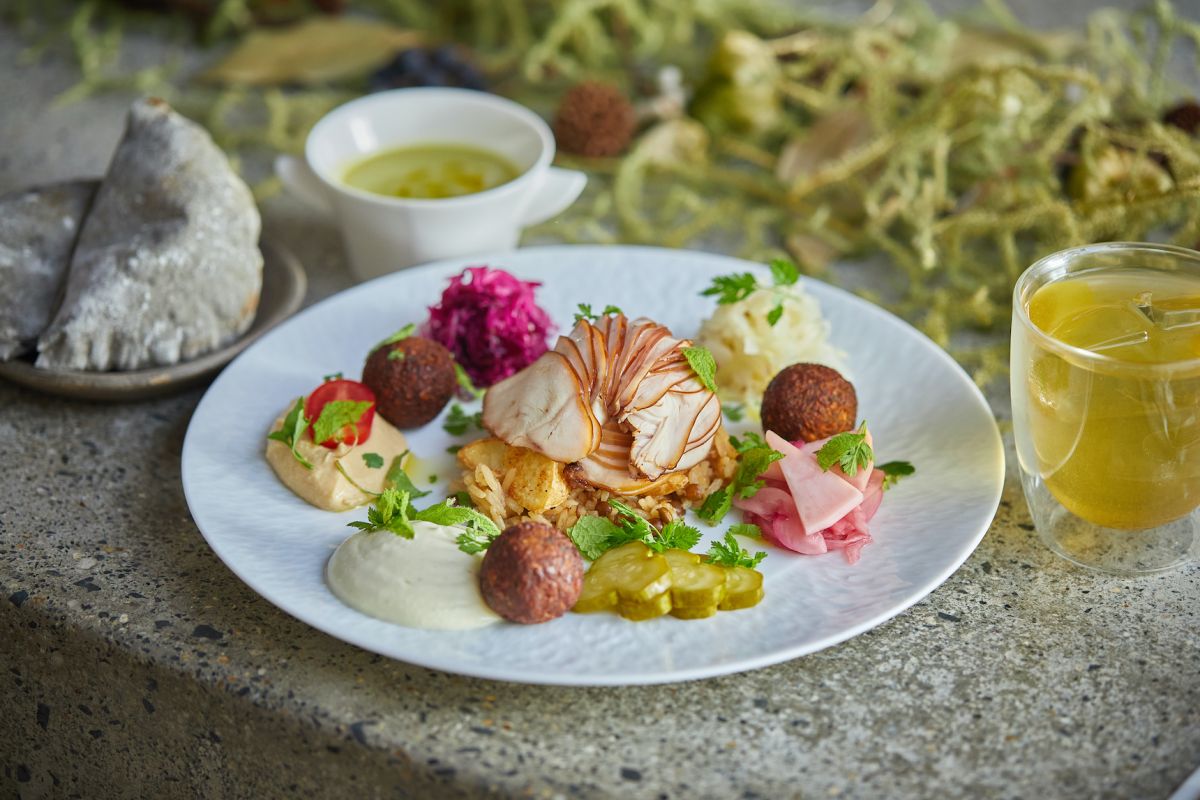 メインのお皿には、ジャスミンライスの上に置かれたスモークチキンを彩り鮮やかなメゼ(小皿料理を意味する)が囲みます。赤玉ねぎのマリネ、ザワークラウト、紫キャベツのフランボワーズビネガー、ファラフェル3個、ガーキンス(キューリのピクルス)、2種類のディップソースとスペアミント、アップルミント、パイナップルミントなど数種類のフレッシュハーブ。