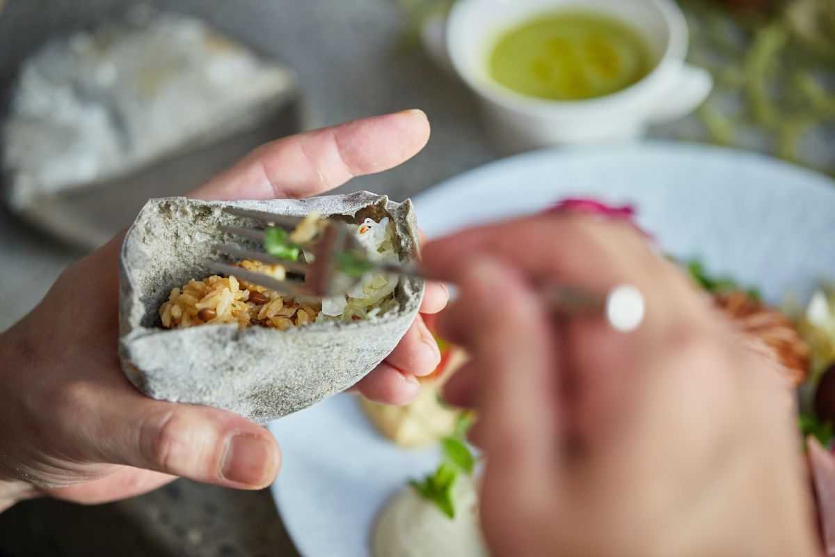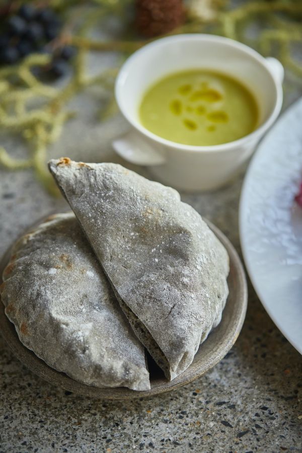 種を蒔いて野菜を育て、調理し、剥いだ玉ねぎや豆の皮は乾燥させて窯の残り火で灰にして、ピタの生地に練り込みます。だから、「汽」のピタパンは灰色。そこには「食を単なる消費にしない」という隠れたメッセージが込められています。
