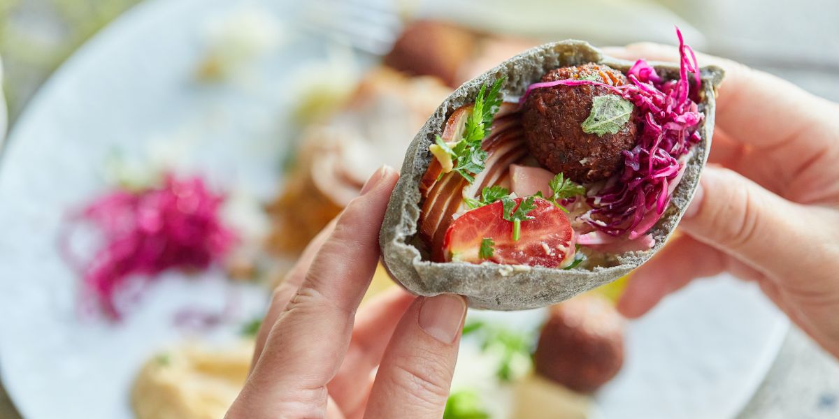 食欲をそそるグレーのピタに具を詰め込みます。ディップもメゼもたっぷり入れるのがポイント。その方が「味にリズムが出てきておいしい」のだとか。素敵な表現ですね。