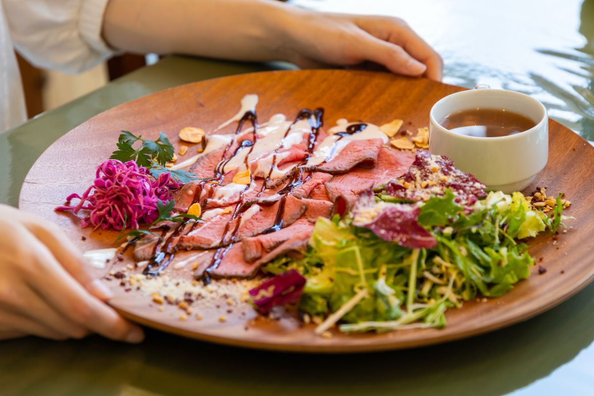 奈良の大和牛を低温調理でやわらかく仕上げた「大和牛プレート ~西洋わさびとヨーグルトのバルサミコソース~」1980円も人気のメニュー。 ヨーグルトソースとバルサミコ酢がお肉にしっかり絡み、ピリリとしたわさびのアクセントも利いてクセになるおいしさです。