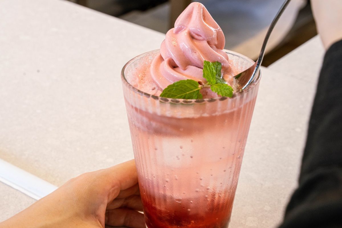 ソーダにもソフトクリームにもいちごがふんだんに使われているので、口に含んだときのいちご感が格別。甘酸っぱい味わいと香りが、観光で疲れた体にやさしく染み渡ります。