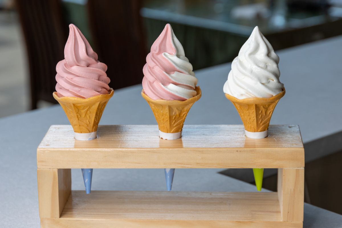 「奈良旅ソフトクリーム」各400円は、奈良いちご・大鉄砲豆乳バニラ・ミックスの3種類を用意。いずれもここでしか味わえないソフトクリームで、味わいも香りも申し分なしです。とくに奈良産の大粒大豆「大和大鉄砲大豆」を使った濃厚な豆乳の風味と、甘酸っぱい奈良いちごのマリアージュが楽しめるミックスは絶品!