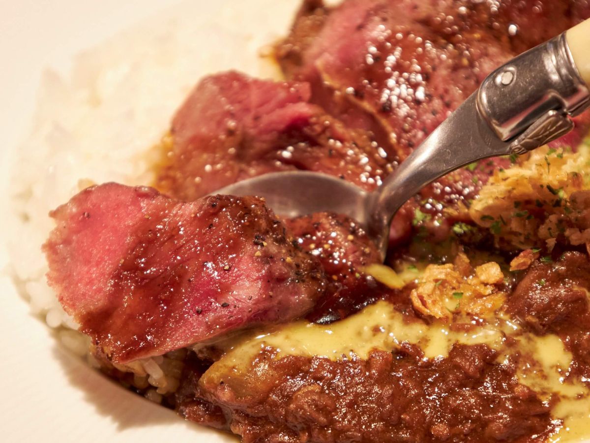コラーゲンを多く含んだ部位をこれでもか!と使い、牛肉のうまみがたっぷり溶け込んだお店自慢のカレーと、口に入れた瞬間に溶けてなくなるほど軟らかいステーキ肉との相性は黄金級!カレールーにかかったマサラソースを絡めて食べるとさらに美味です。