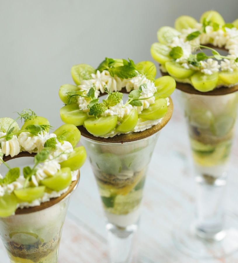 旬のシャインマスカットをふんだんに使用して再登場したのは「Parfait a la corolle de Muscat【シャインマスカットの花冠パフェ】」2200円(ドリンクセット2750円、テイクアウト1300円)。米粉やラカントを使用しギルトフリーなパフェに仕上げています。花冠をイメージしたトップには、リコッタチーズクリーム、下層には白ワインのジュレを重ね、アクセントに抹茶を加え、最後までサッパリと楽しめる味わいに。