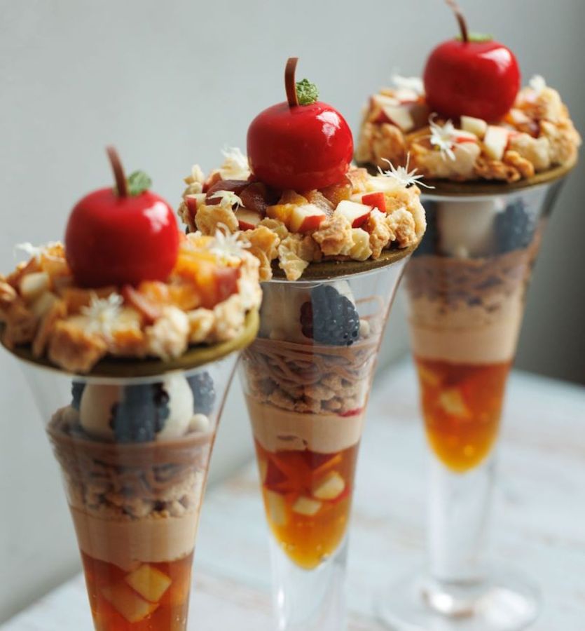 「Parfait aux Pommes【秋のリンゴパフェ】」2100円(ドリンクセット2650円、テイクアウト1300円)は、アーモンドミルクを使用したムースの真っ赤なリンゴが美しく目を引きます。その下には、ソテーしたリンゴとフレッシュのリンゴを忍ばせて。アーモンド、アールグレイ、マロンやキャラメルなど、深まる秋を一層ごとにふんだんに感じる味わいに仕上げています。