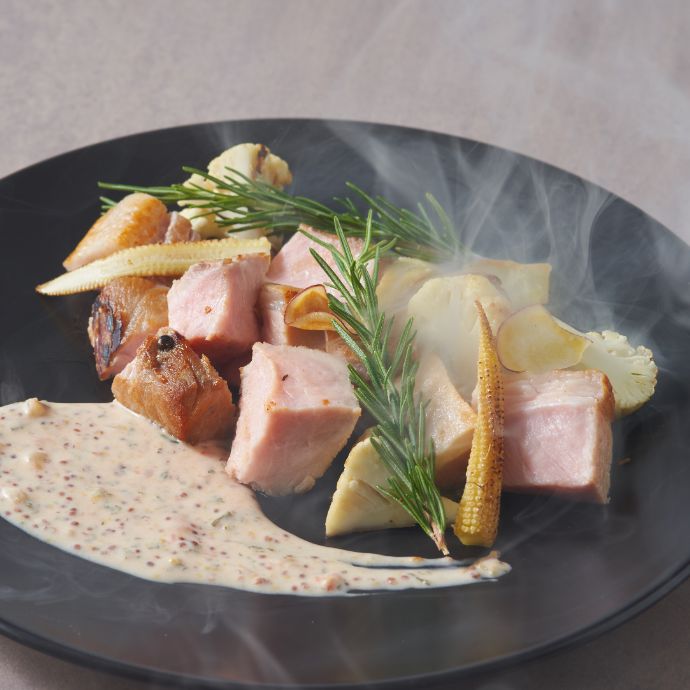 「スモークジューシーポーク」は低温調理でジューシーに仕上げたローストポークをお客様の目の前で瞬間燻製するひと皿。蓋を開けた瞬間に広がるサクラチップスモークの香りが食欲をそそります。