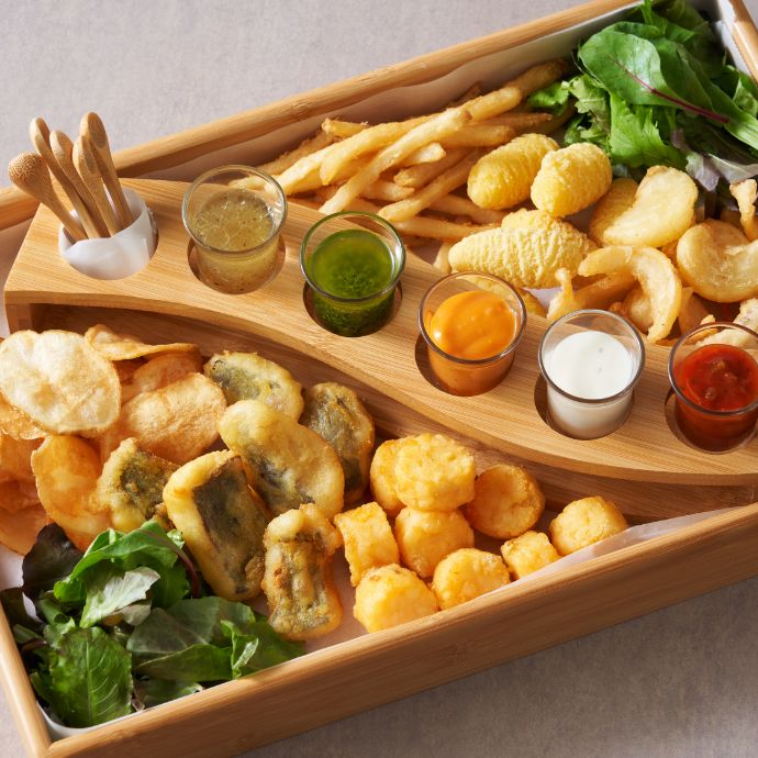 「5種ソースのカスタムポテト」はテーブルが盛り上がること間違いなし!いろいろな種類のフライドポテト、フィッシュフライに加え、ディップするのは5種類のオリジナルソース。いつまでも飽きずに食べ続けられる、女子会など大人数での飲み会にぴったりのおつまみセットです。