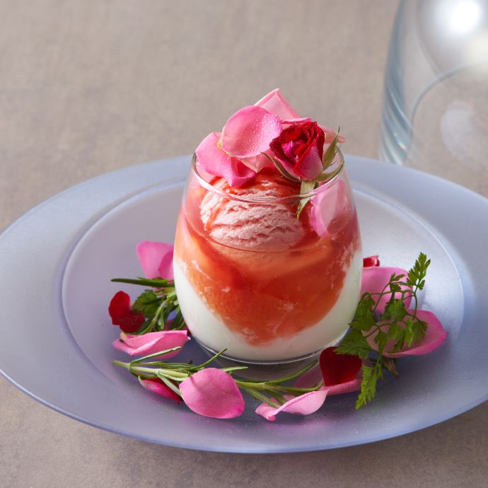 バラの「香り」を楽しむアイスパフェの「香りを食べるローズパフェ」。世界的グルメガイドの星付きレストランでも採用されている食べられる生のバラに、田村浩二シェフが開発したバラジャムを添えています。蓋を開けると広がるバラの甘く華やかな香りと甘酸っぱさを楽しんで。