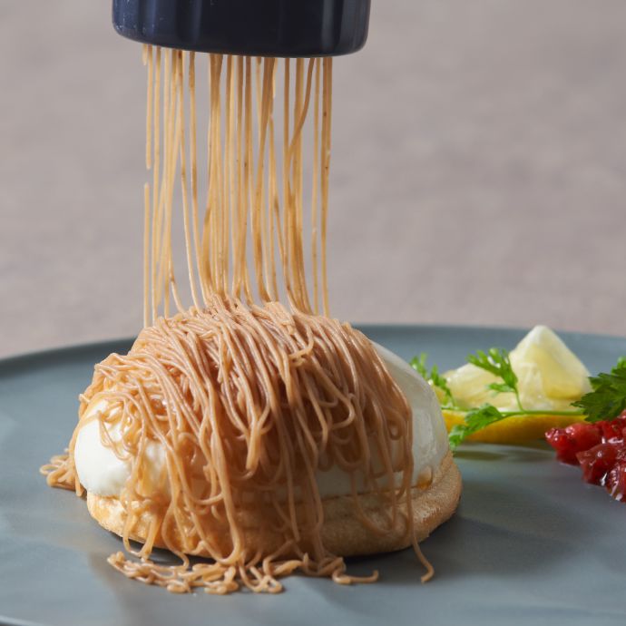 「自分で作る!生しぼりモンブラン」はサクサクのメレンゲの上にアーモンドミルククリームをのせた状態で提供。最後に自分でモンブランペーストを搾って仕上げます!できたて0秒で食べることで香りの強いモンブランペーストの濃厚さと、メレンゲのサクサクの食感を楽しむことができるスイーツです。