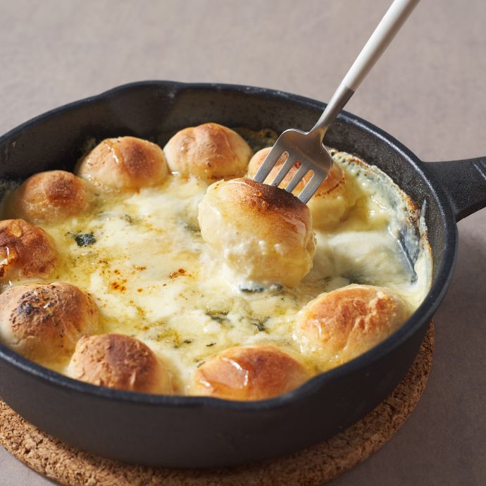 こちらは、コロコロしたかわいいピザ生地をつまんで、とろとろになった4種のチーズをディップして食べる新感覚のダッチオーブンピザ「ピザフォンデュ:とろとろクアトロフォルマッジ」。みんなでワイワイ楽しめるひと皿です。