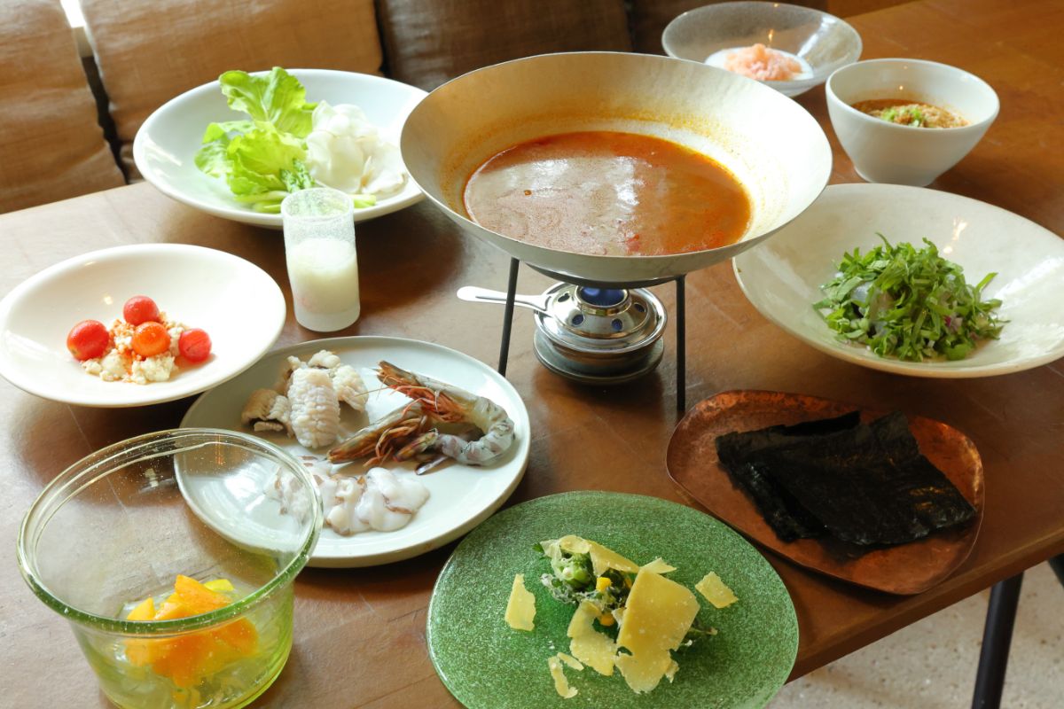 1階のダイニングでいただく夕食は、熊本県を拠点に活動する料理家・細川亜衣氏が監修したコース。前菜数点にメインの鍋、デザートが付きます。どの料理にも尾道を中心とした瀬戸内の食材が余すことなく使われているのが特徴。器も料理に合わせて全国各地の作家のものを使用しており、皿と料理の色彩のコントラストに目を奪われました。季節により内容は異なり、この日の前菜は、ハーブの青いかき揚げやパプリカとマンゴー、生姜ドレッシングであえた春雨など。ここでしか味わえない食材の組み合わせに驚きです。