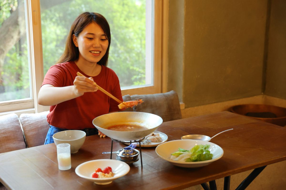 メインはカレー鍋。昆布やいりこでだしを取ったカレースープに、尾道の野菜や瀬戸内海でとれた海鮮をしゃぶしゃぶしていただきます。甘味と辛味のバランスが絶妙なカレーに新鮮な魚介類と野菜の相性は抜群。別添えの温泉卵を入れると、まろやかな味わいに変わりました。