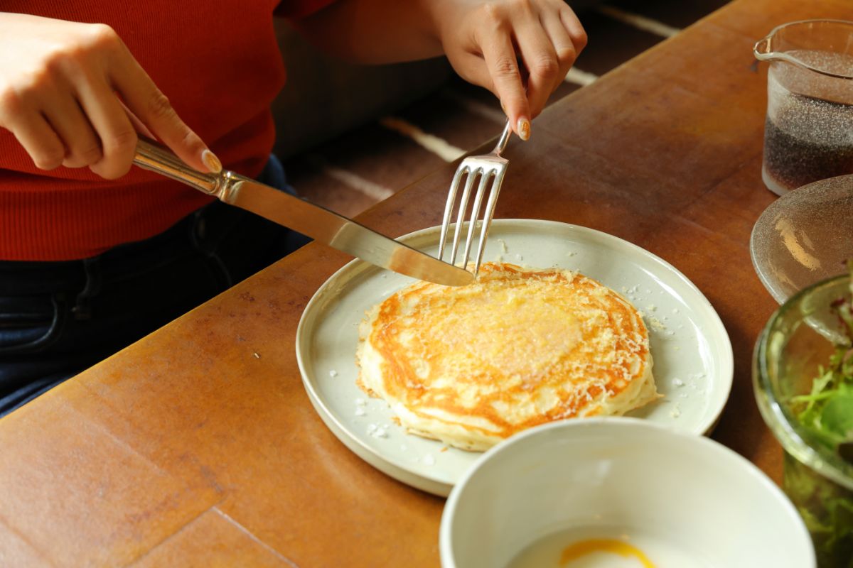 朝食も細川亜衣氏が監修。この日のメニューは尾道の野菜を贅沢に使ったスープとサラダ、パンケーキ、リコッタチーズと果物です。メインのパンケーキには、目の前で地元産のチーズをたっぷり削ってくれます。その上からメープルシロップをかけて甘じょっぱさを楽しむのもおすすめです。ダイニングの大きな窓から見える庭の様子は、明るく爽やか。朝日を浴びて気持ちのいい一日の始まりです。(朝食の利用は宿泊者のみ)