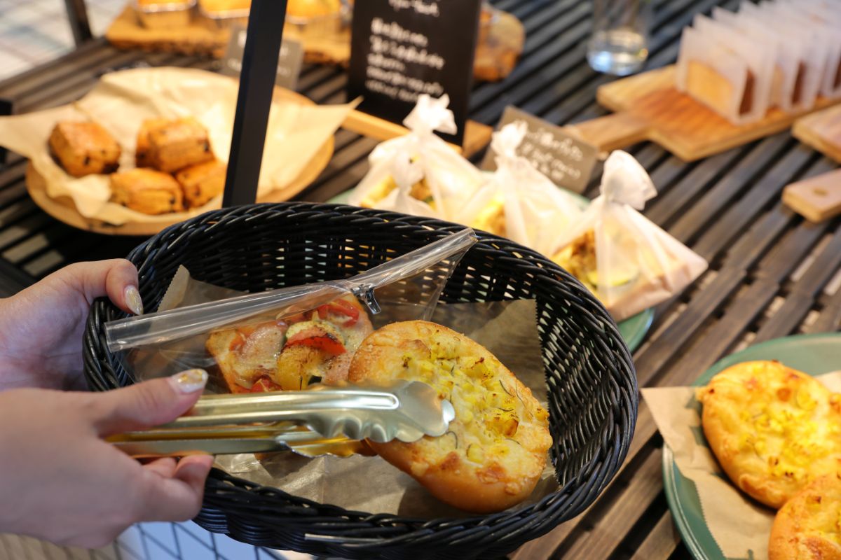 館内の奥にあるベーカリー「Butti Bakery(ブッチ ベーカリー)」。店名の「Butti」は広島弁で「とても」を意味する「ぶち」からきていて「とてもおいしい」パンを届けたいという思いが込められています。天然酵母のルヴァン種を使用した食パンの上に、季節の野菜などがたっぷりトッピングされた「のっけトースト」250円が人気。ほかにも惣菜パンやおやつパン、焼き菓子なども豊富に揃います。テラス席でいただけば、心地よい潮風が感じられる爽快なティータイムに。