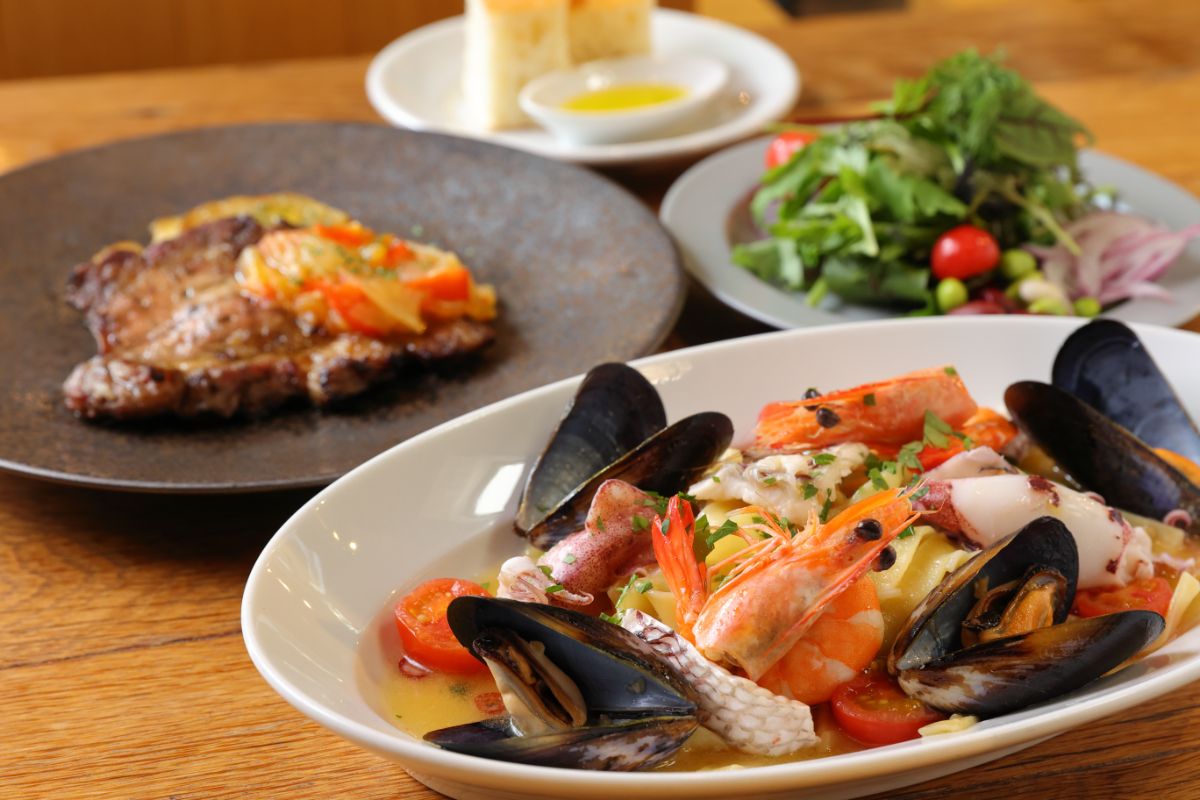 今回はランチに「豪快魚介のペスカトーラ フェトチーネ」2310円をチョイス。愛媛県産の鯛や広島県向島のムール貝、瀬戸内海でとれたイカなど海の幸がたっぷりです。魚介類は身がしっかりとしていて食べごたえ抜群。パスタは生麵を使っているのでもちもちの食感です。「岡山黒豚のグリル ピペラード」2200円は炭火でグリルされた豚肉に、玉ねぎやパプリカなどの地元産の季節野菜が盛られています。香ばしい豚肉に甘みのある野菜がベストマッチ。ワインを頼みたくなる一品です。