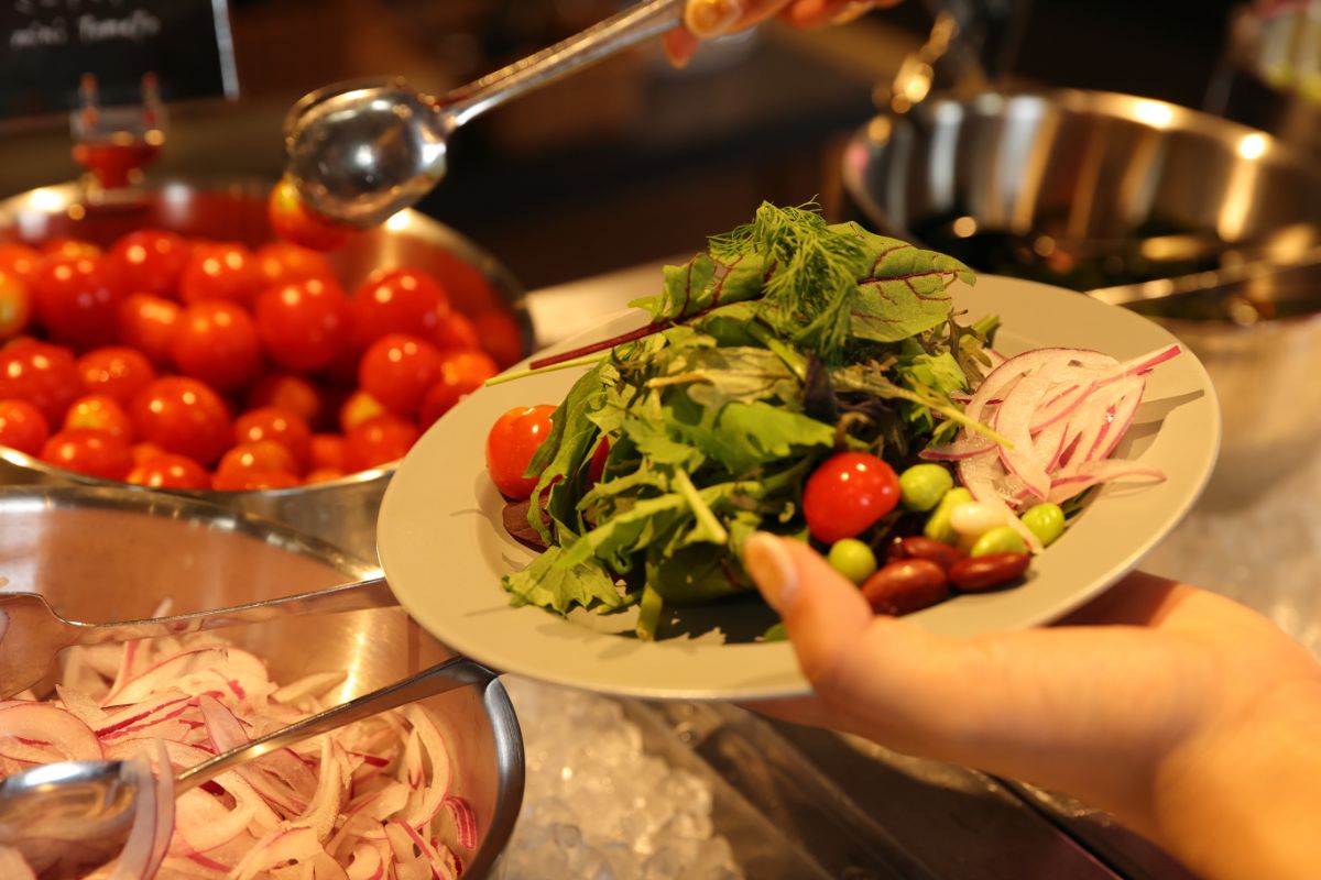 ランチには+550円で、サラダと自家製フォカッチャのビュッフェ、ワンドリンクを付けられます(土・日曜、祝日のみ)。サラダは地元の季節野菜を使ったオリジナルドレッシングと一緒に。尾道にある「尾道造酢」の酢をブレンドしたいちじく酢のドレッシングは、甘味と酸味のバランスが絶妙で、味わいの濃い地元の野菜と相性抜群です。館内でも販売しているので、気に入ったらおみやげに購入することもできます。