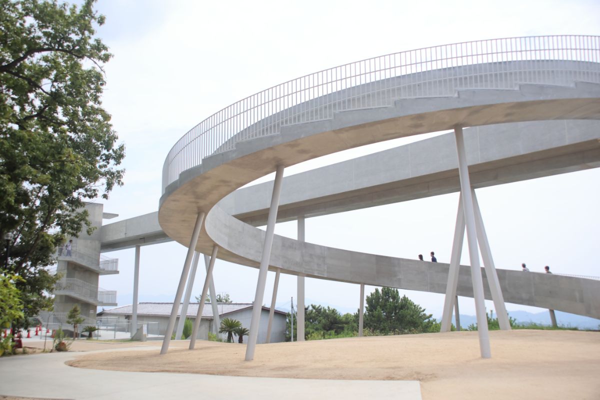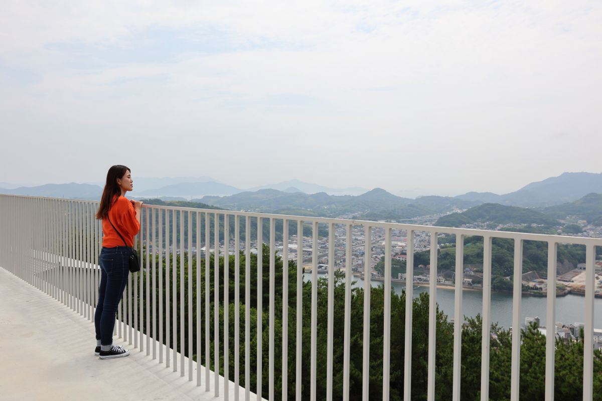 千光寺にお参りし、尾道ゆかりの歌人の詩が刻まれた石碑のある「文学のこみち」を過ぎると「千光寺公園」に到着。2022年3月に約65年ぶりのリニューアルを終えた「千光寺公園」の展望台は標高144mほどで千光寺山の山頂にあります。愛称は頂上を意味する「PEAK(ピーク)」。スタイリッシュなデザインが印象的です。奥行きがあまりなく、細長いのでどこからでも景色を楽しめるのが特徴。展望台からは尾道水道の街並みや瀬戸内海に浮かぶ島々が望めます。天気のいい日は四国山脈まで見渡せるそうです。