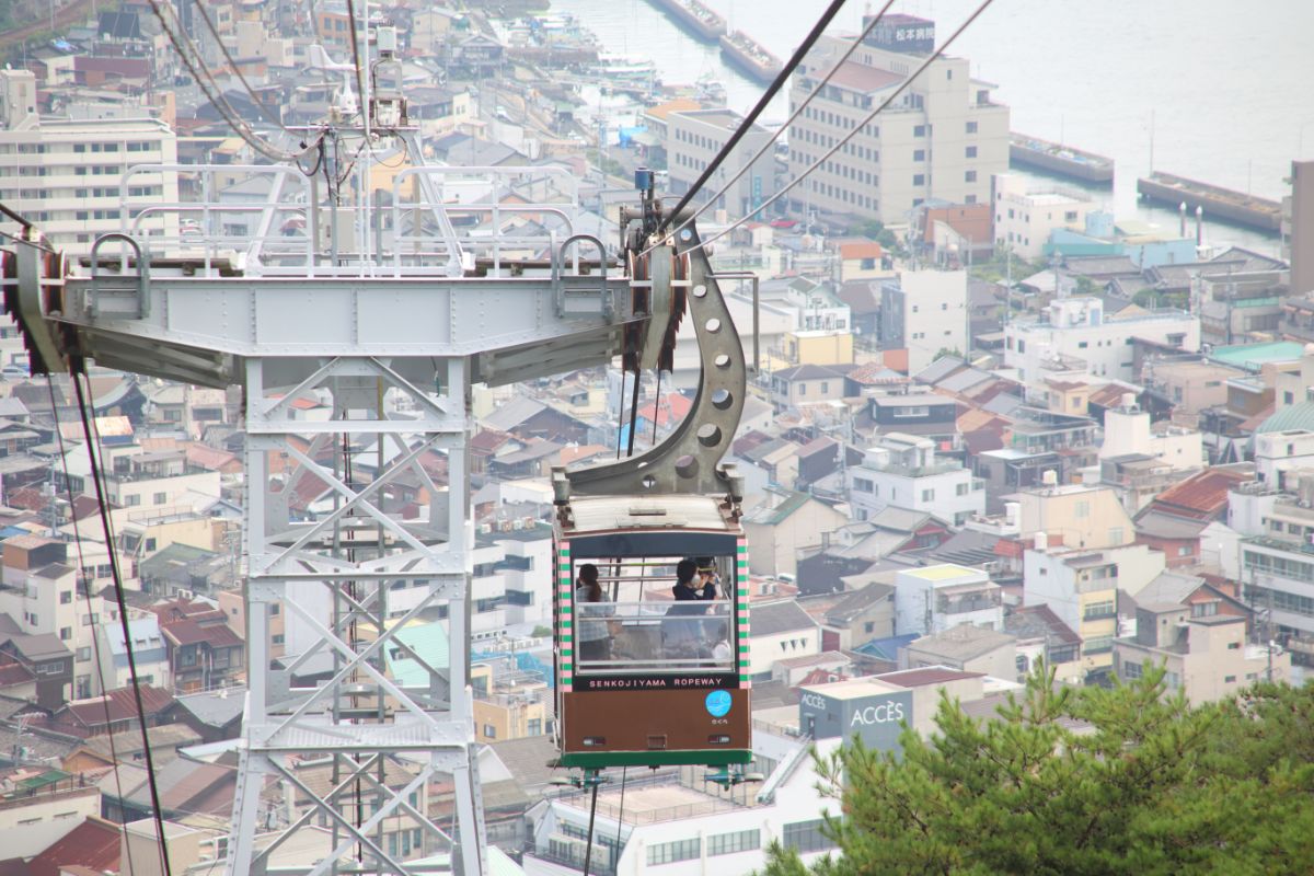 ロープウェイは昭和32年(1957)に開業。現在のロープウェイは三代目の車両です。窓からは尾道の街並みを見下ろすことができ、春には桜などの季節の花が彩りを添えます。運行は毎時15分おきで、混雑状況によっては臨時便も出るのだとか。尾道の街に吸い込まれていくような気分を味わいながら「千光寺公園」を後にしました。