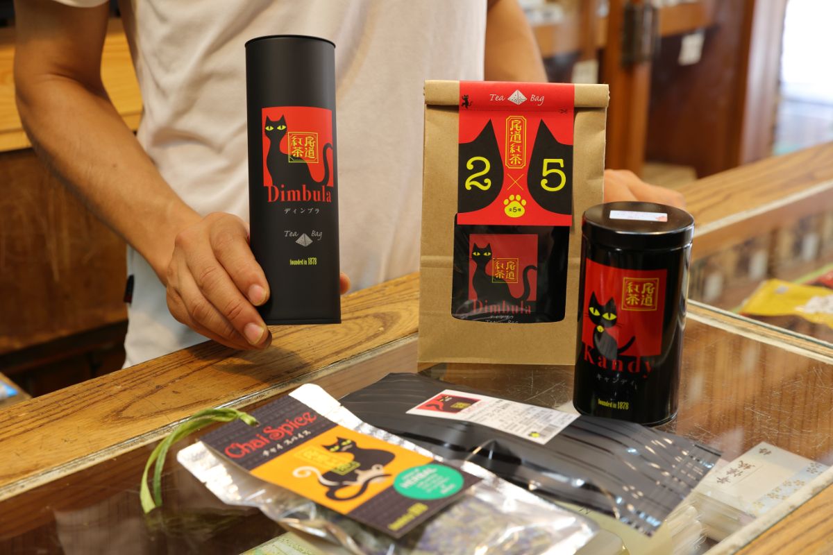 尾道では戦前、セイロン茶の輸入を行っていましたが、第二次世界大戦で輸入が禁止に。それから65年後の2005年に輸入が再開され「尾道紅茶」として販売されることになりました。扱っている茶葉は5種類。ティーバック20パック1512円、「尾道紅茶 アソード(ティーバッグ)」5種類×2個入り1080円などが揃います。こちらは、ネコのパッケージがかわいい尾道紅茶シリーズ。今回は、今川さんにアドバイスをもらいベーシックな「ディンブラ」と、ミルクティーにおすすめという「ウバ」をチョイスしました。いずれも洋菓子にぴったりです。お茶と一口に言っても種類はたくさん。いただくシーンを考えてチョイスするとティータイムや食事が楽しくなりますね。