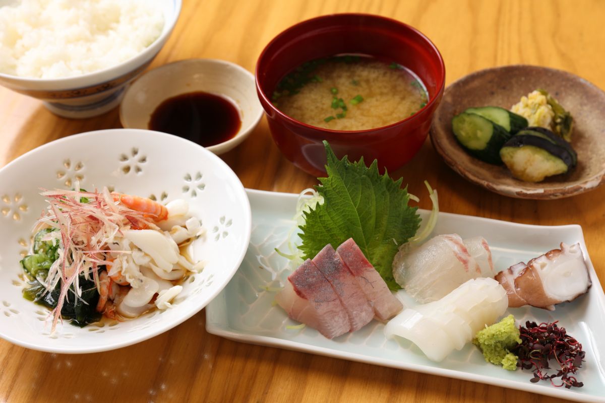 ランチに「刺身定食」1800円を選びました。しっとりとした鯛、コリコリとした食感のイカやタコの刺身をお店でブレンドした醤油に付けていただきます。ほかにはゲソとエビ、小エビの酢の物、鯛のアラを尾道の天然水で煮込んだあら汁などが付きます。ご飯は広島県産のせら高原のコシヒカリで、粘り気と爽やかな風味が絶妙。刺身は大きめに切られていて、異なる食感が楽しめます。さらに酢の物や自家製の漬物の味にほっこり。ほかにも季節の鮮魚を使った「上握り鮨」2000円がおすすめです。尾道の新鮮な食材をたっぷりと味わうことができ、大満足のランチになりました。