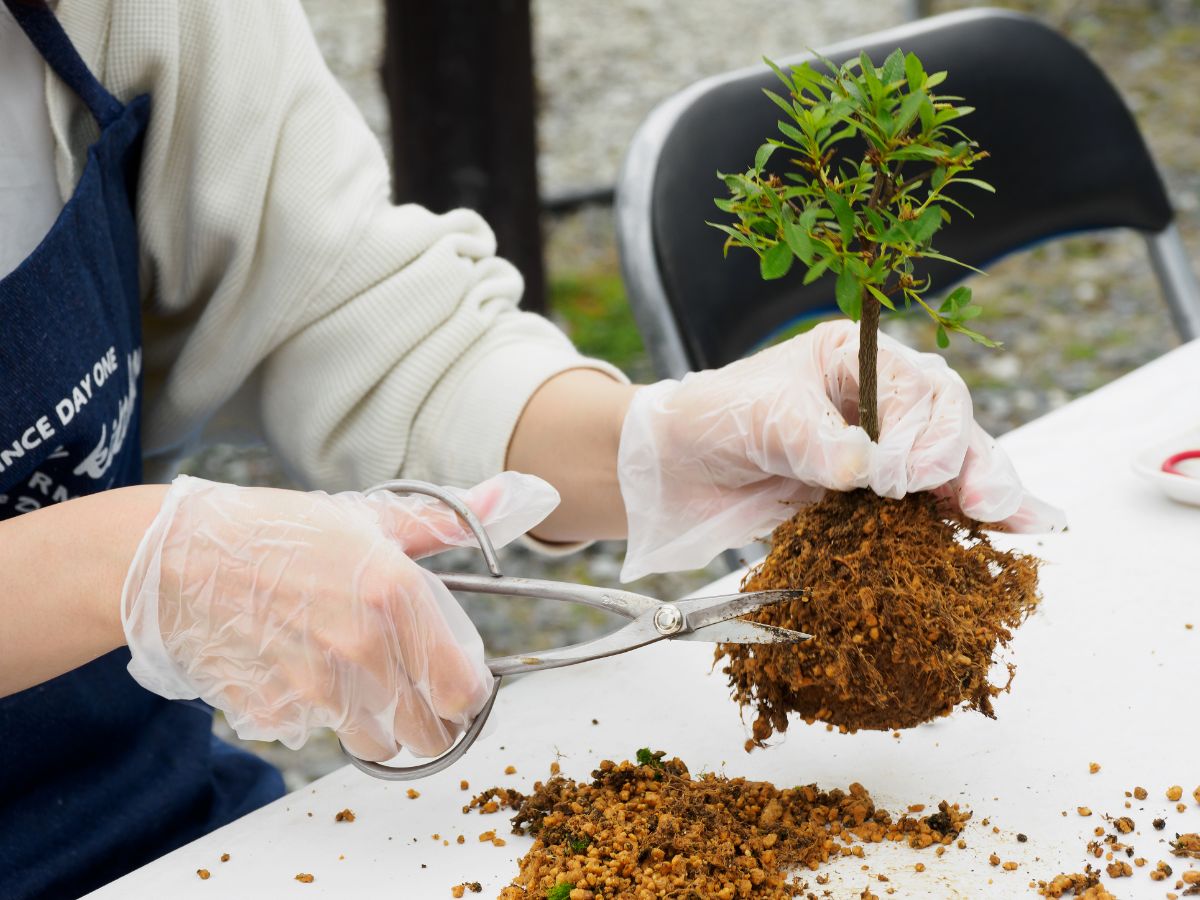 整えた後は苗の正面を決めて鉢へ植え込み、養土などを加えて完成です。それぞれの工程はシンプルなので初めてでも安心してチャレンジできます。「どんな鉢に仕上げたいのか」を考えながら作業するため、日常を忘れて没頭。完成した鉢はそのまま持ち帰ります。自分で作り上げた盆栽なので愛着もひとしおです。