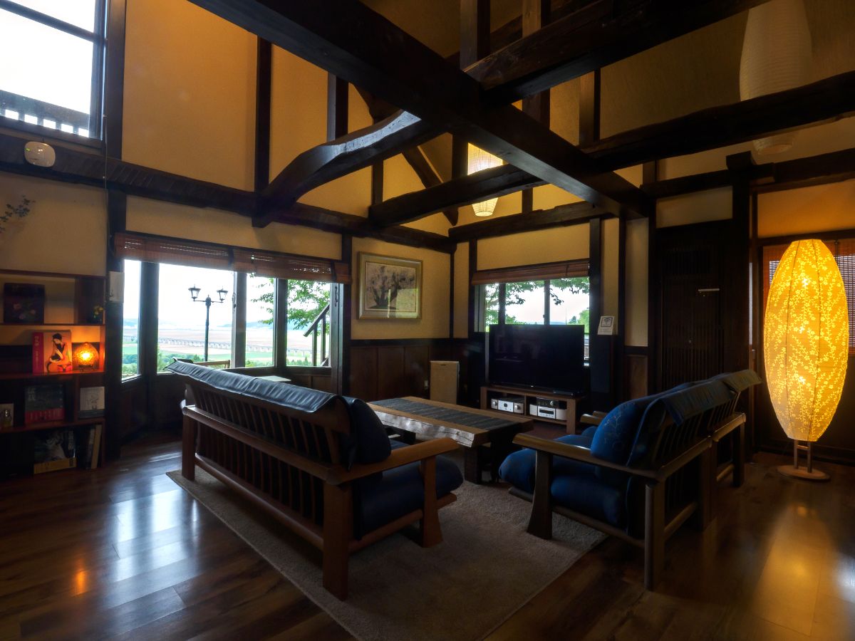 宿泊施設の「天空のお宿 盆栽民宿 雅館」は1日1組限定の1棟貸しスタイル。高台に位置するため、田園風景を一望できます。北上川と田畑の美しさはもちろん、目の前に広がる空の広さにも心を奪われます。一般道路から離れているため静けさに包まれていて、時には野生のカモシカが庭に現れることも。出合える運に期待したいですね。