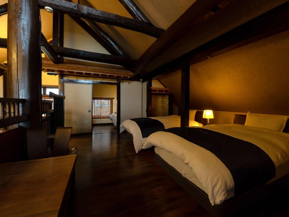 2階は寝室スペースが2部屋。ベッドはシングルサイズ1台と、セミダブルサイズ2台の計3台が用意されています。間接照明が柔らかく室内を照らし、リゾート感もたっぷり。テラススペースもあり、窓を開ければ爽やかな風と開放的な眺望を楽しめます。満天の星空を眺めながらロマンティックな夜を過ごしましょう。