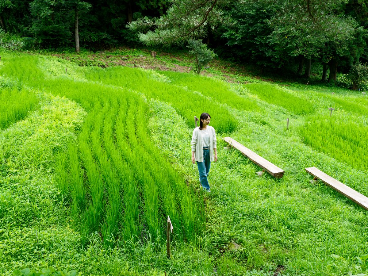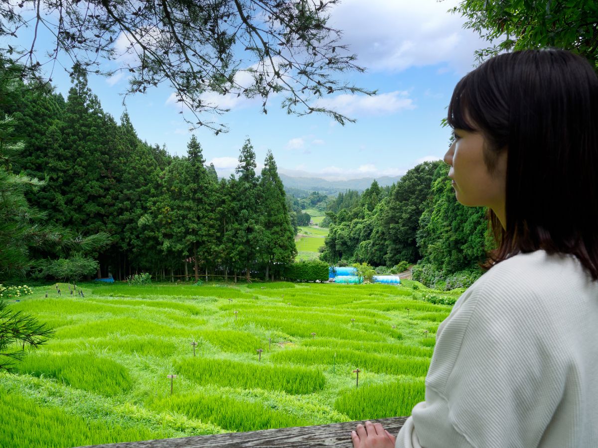「金山棚田」には、田おこしから脱穀まで米作りに参加する棚田オーナー権という制度があります。1つの棚田のオーナーになり、楽しみながら棚田の保全活動や農業に興味をもってもらおうという取り組みです。ベンチや展望デッキがあり、オーナーでなくても誰でも自由に散策することができます。展望デッキに立つと、爽やかな風が通り抜け清々しい気持ちに。肩の力がすっと抜けていきます。