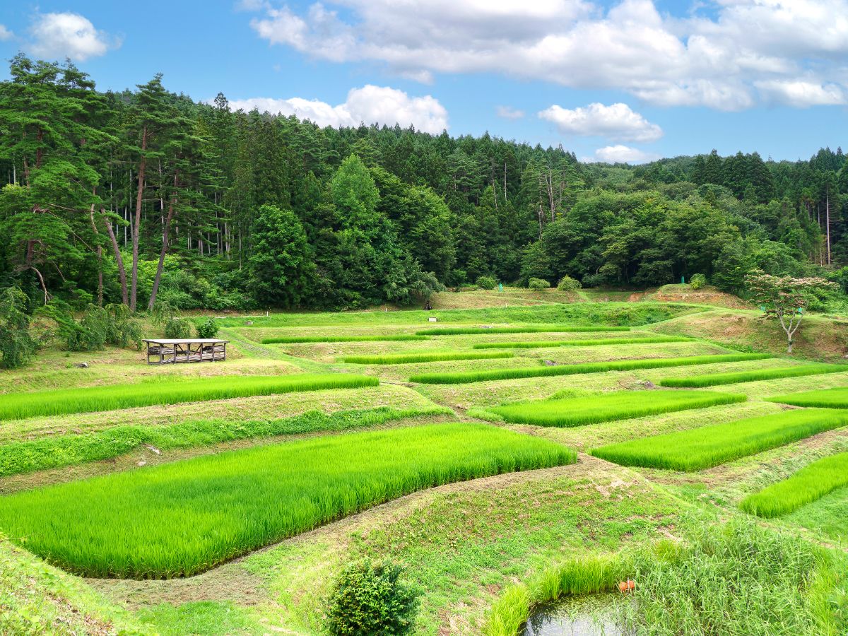 次に訪れたのは「金山棚田」から車で35分ほど東へ向かった場所にある「山吹棚田」。2ヘクタールの斜面に約40枚の水田が並んでいます。遠くには室根山を望み、初夏には周りの木々の新緑と稲の共演が、秋には刈り取った稲を昔ながらのハセ掛けで乾燥させる光景が見られ、日本の原風景を思わせる四季折々の絶景が広がります。日本の農村文化の素晴らしさを体感できる棚田は、時を忘れてゆっくりと過ごしたくなる特別な空間です。