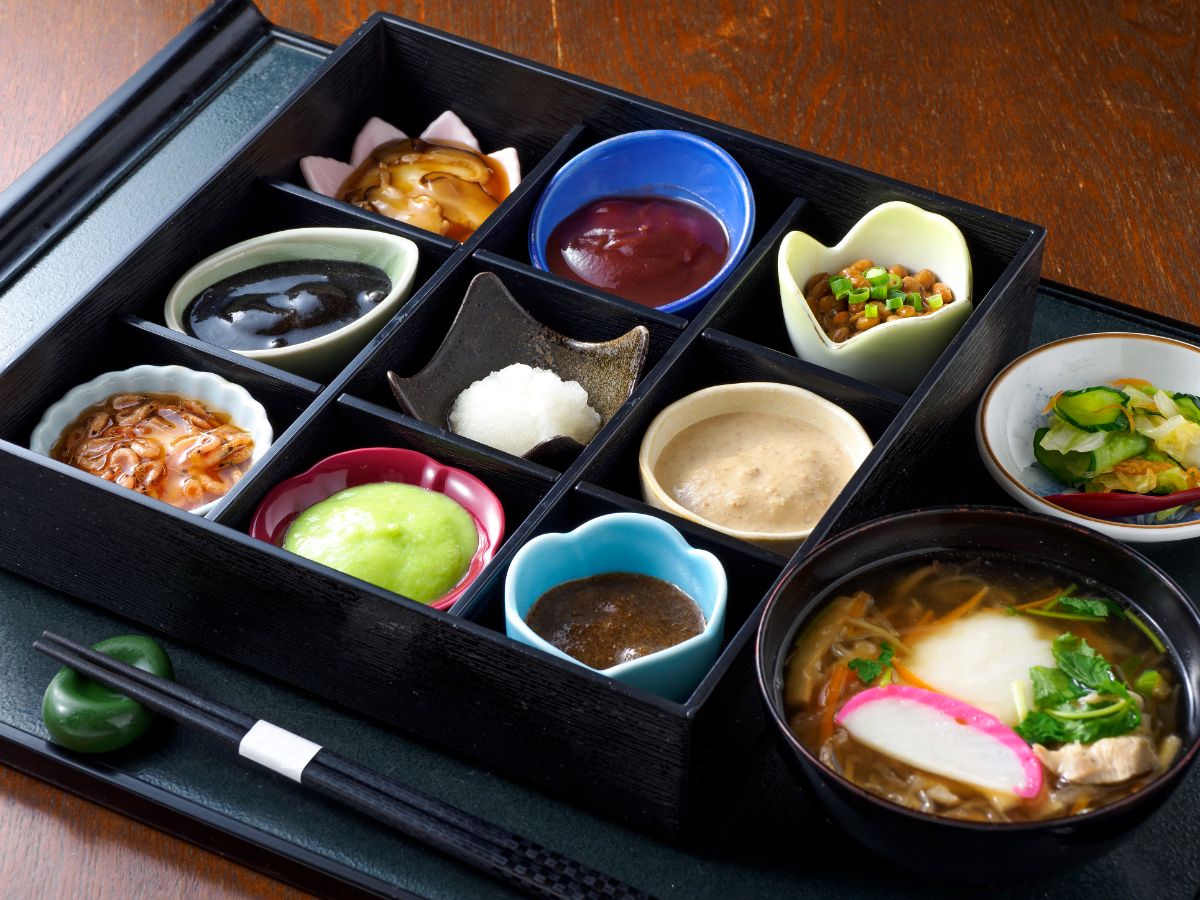ちょっとずついろいろな味がうれしい「元祖ひと口もち膳」1750円は、雑煮も含めた9種類のもちが並ぶ看板メニュー。くるみやショウガ、ずんだ、じゅうね(エゴマ)、エビなど伝統的なあんが揃っています。多彩な味わいに、おもてなしの心が伝わってくるよう。膳の中心にある大根おろしは味のひとつではなく、箸休めのため。「たくさんの味を食べてもらいたい」という同店の女将さんの思いから、もちは食べやすいひと口サイズのため、品よく口に運べます。