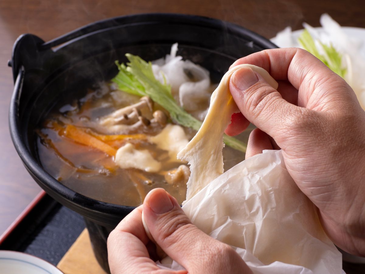 南部小麦の産地でもある一関市でぜひ食べたい料理のひとつが「はっと」です。「はっと」とは、小麦粉に水を加えて練って熟成させた生地を薄くのばし、茹でて食べる郷土料理のこと。名前の由来は、一斗(いっと)の小麦から八斗(はっと)作られたこと、あるいは、かつてお殿様が食べてあまりにおいしくご法度にしたことなど。数々の伝説に思いを馳せながら食べるのもいいですね。