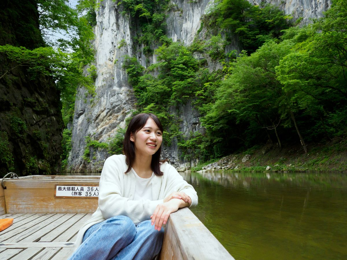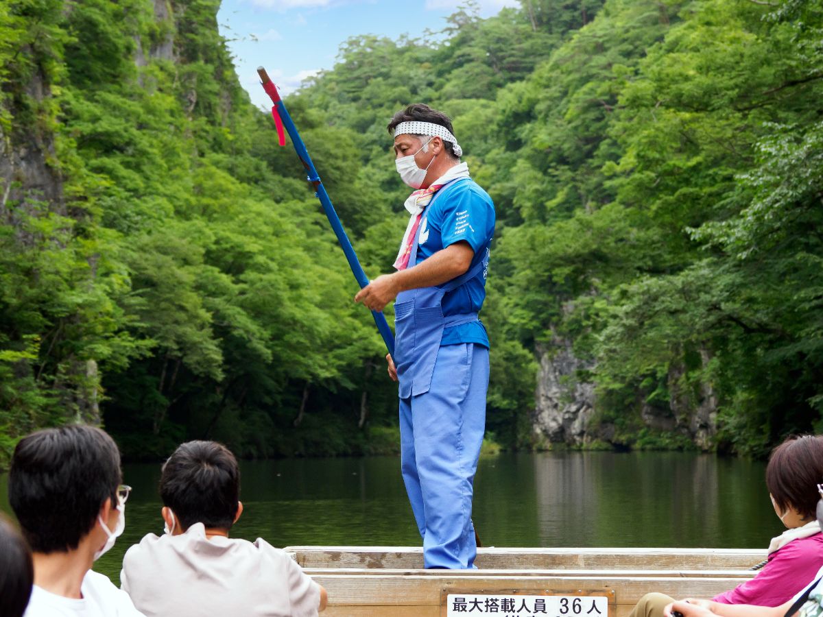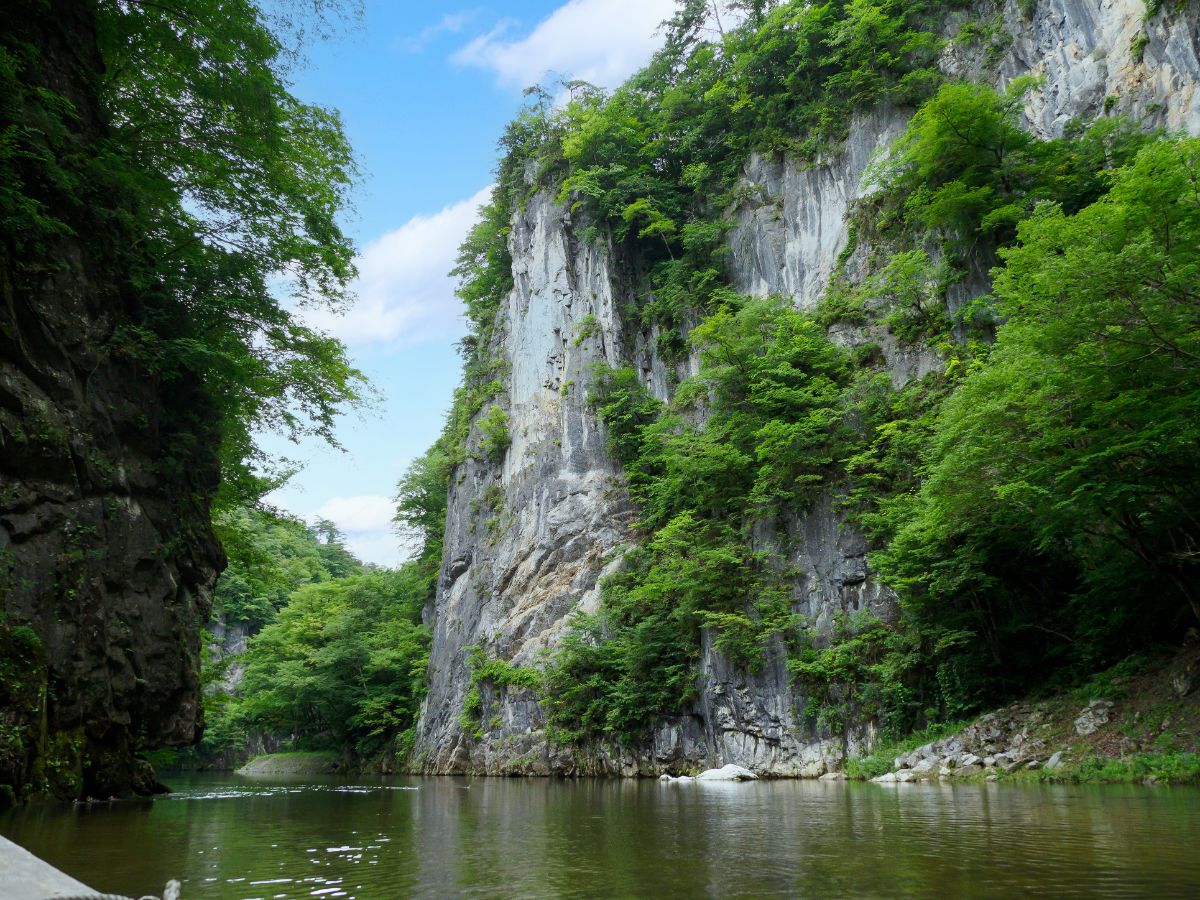 岩手県内有数の景勝地「猊鼻渓(げいびけい)」。砂鉄川が石灰岩を浸食してできた約2kmの渓谷に沿って、静かな流れの川を船頭が長い棹一本のみで操り、手漕ぎで進んでいくのが「猊鼻渓舟下り」です。両岸にそびえる高さ約100mの断崖・奇岩が迫力満点。