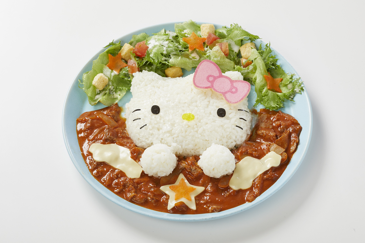 ハローキティの顔が特徴の「ハローキティのゴーカートハヤシライス」1628円。トマトハヤシとチーズのコンビネーションがたまりません。